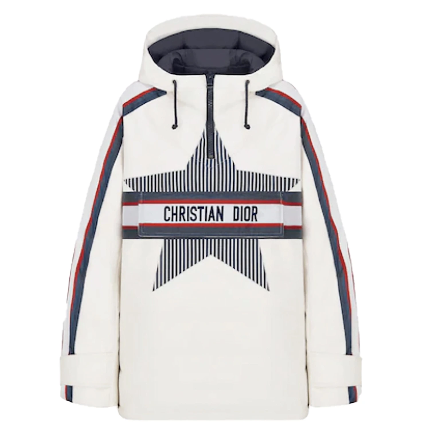 Description : Issu de la capsule DiorAlps, l’anorak à capuche revisite l’univers des sports d’hiver à travers les codes couture de la Maison. Confectionné en taffetas technique matelassé blanc à motif Dior Star tricolore au dos, il présente une encolure zippée, une poche passepoilée, deux poches latérales, ainsi qu’un rabat rehaussé de la signature CHRISTIAN DIOR. Sa silhouette décontractée complétera toutes les tenues casual de la saison, et il pourra être associé aux autres créations DiorAlps pour un total look.