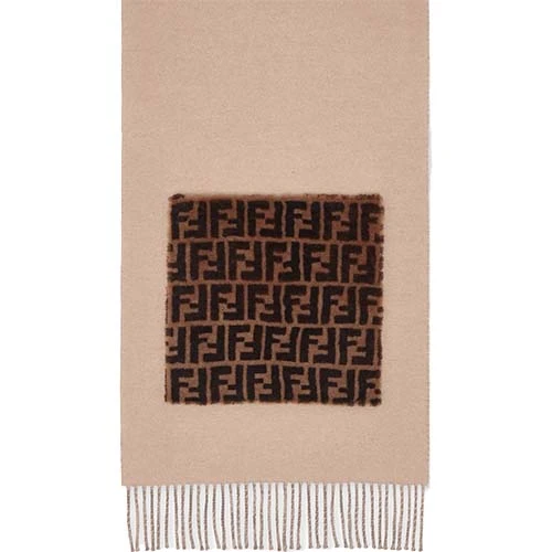 Foulard réalisé en mélange de laine et cachemire beige. Grandes poches en peau de mouton avec motif FF.
