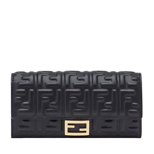 Description : Portefeuille continental Baguette à bouton-pression. Spacieux et bien organisé, avec deux poches à soufflet, une poche zippée, dix fentes porte-cartes et des poches latérales plaquées. Réalisé en cuir nappa noir. Finitions avec motif FF en relief. Accessoires métalliques avec finition dorée.