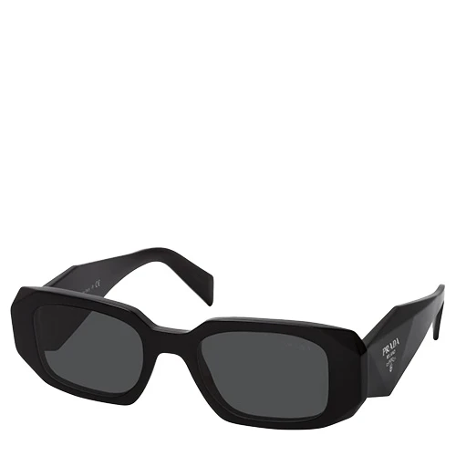 Des lunettes Prada signées du logo de la maison — le triangle, soit une signature minimale, neutre et fleurante bon l’aspect graphique et avant-gardiste de la griffe.