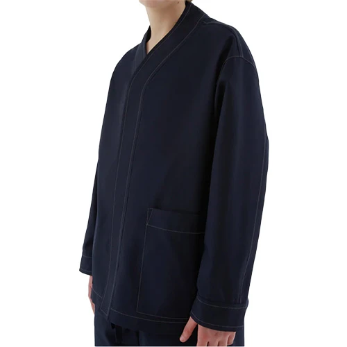 Blazer bleu à manches longues avec col en Y. Fermeture boutonnée dissimulée à l’avant et poches plaquées à la taille.