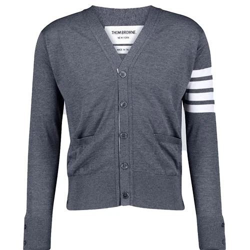 Ce cardigan gris à col en V classique de Thom Browne est fabriqué en laine mérinos, possède deux poches plaquées et est orné de la rayure à 4 barres caractéristique sur le bras, ainsi que d’une languette en gros-grain emblématique de la marque.